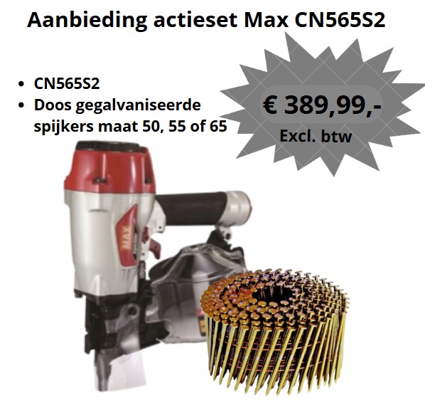 De MAX Coilnailer CN565S2 is geschikt voor zowel nagels op draad gelast als op plastic band. De coilnailer  tacker heeft diverse onderscheidende kenmerken zoals: klein frame en meer kracht (6,8%) ten op zichtte van zijn voorganger, smalle contact arm guide (geen afdruk van de slagpen), anti-vuilfilter, instelbare luchtuitlaat en diepte-instelling, preventie tegen dubbel schieten en comfortabele rubber grip.
